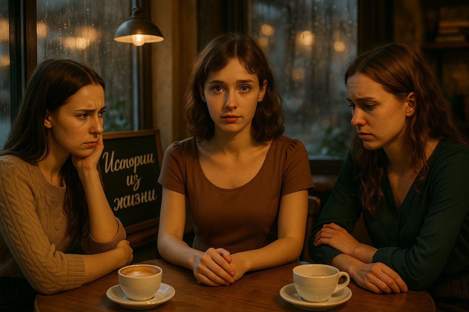 Вечером Анна всё же пошла в привычное кафе. Сквозь окна, заляпанные дождевыми полосами, было видно, как сгустился осенний сумрак. Ульяна и Дарья уже сидели у большого окна и грустно листали меню. Дарья с порога сделала недовольное лицо: