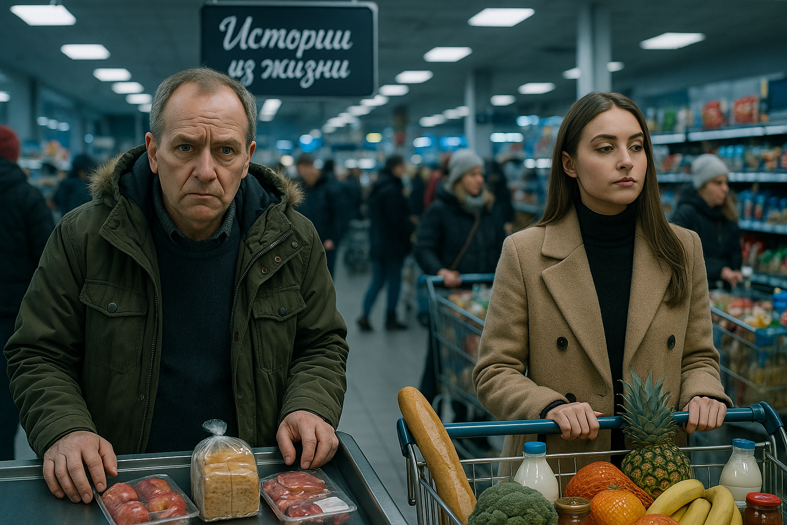 Иван тяжело переступал с ноги на ногу, пытаясь согреться в зимней суете. Магазинный зал был переполнен: полки с продуктами, кашляющие покупатели, смятые тележки. Он выдохнул и встал в очередь к кассе, радуясь, что осталось всего несколько человек, и можно будет побыстрее рвануть домой.