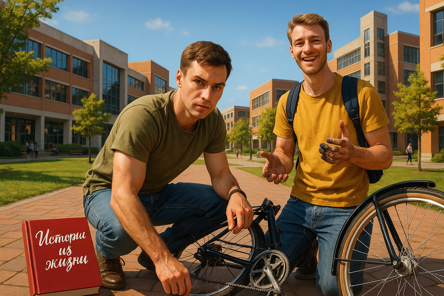 Игорь застыл на месте, возвращаясь с лекции по социологии. Он был парнем из маленького российского городка и только-только привыкал к шумной многокультурной среде. За эти несколько месяцев он успел понять, что здесь, среди стеклянных корпусов и аккуратных тропинок, каждый обычно занят своими мыслями. Но вид чужака, беспомощно глядящего на сломанный велик, вдруг задел в Игоре что-то родное.