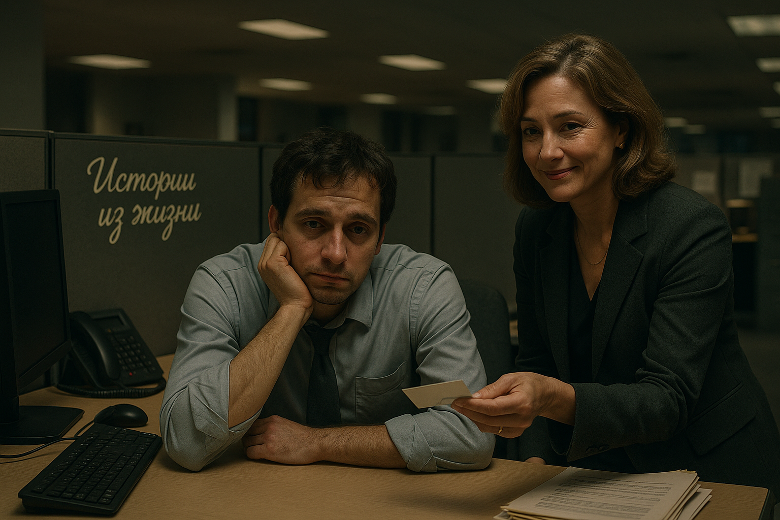 На следующий день в офисе всё повторилось. Те же стенания сотрудников, те же серые кубиклы, полная безнадёжность в воздухе. Только вот мне уже не до офисной монотонности: в какой-то момент я буквально скрючился от боли. Коллега в синем костюме обеспокоенно взглянул, а рядом сидела пожилая женщина — новая сотрудница, пришла, кажется, на место уволившегося финансиста. Она нахмурила брови и спросила, всё ли со мной в порядке.